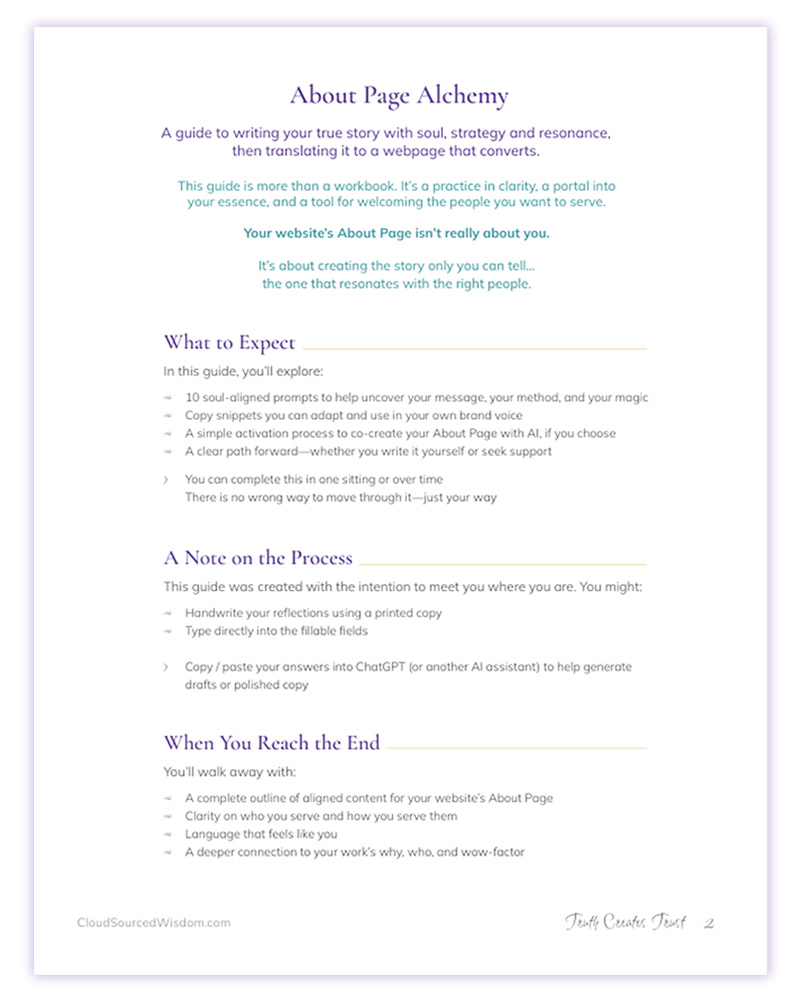 About Page Alchemy helps you uncover the values, experiences, and energy that make your work magnetic—then guides you through shaping it into a webpage that connects, converts, and feels true.