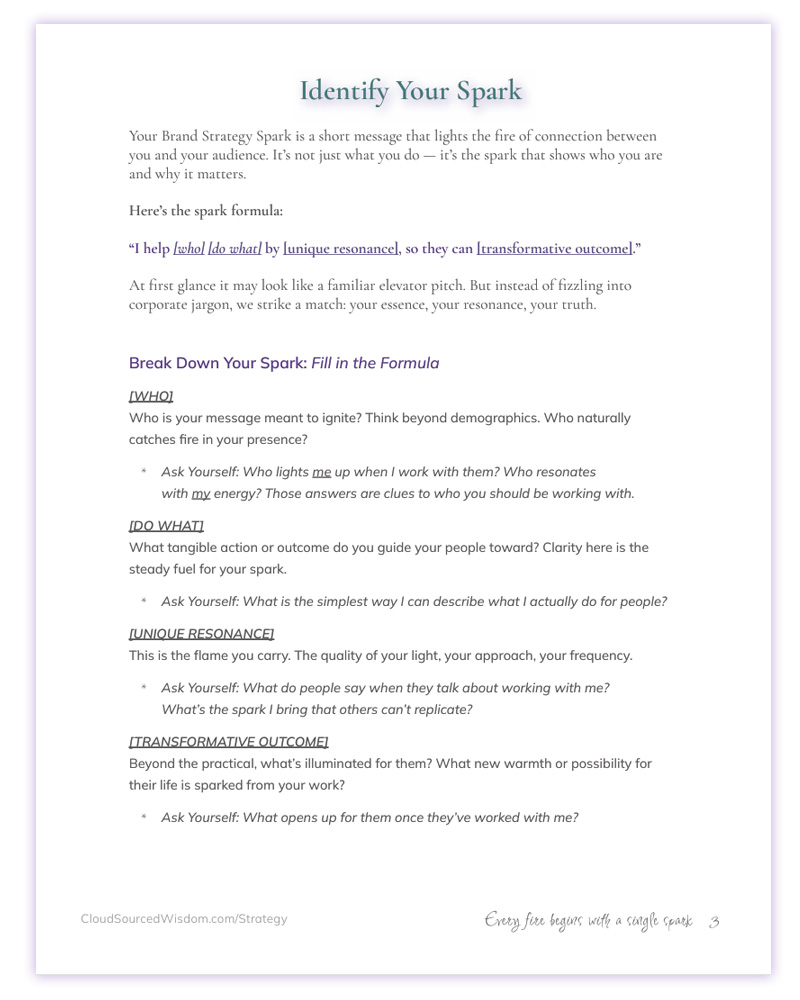 This FREE guide helps you uncover your Spark—the clear, magnetic essence of what you do, who you serve, and why it matters.