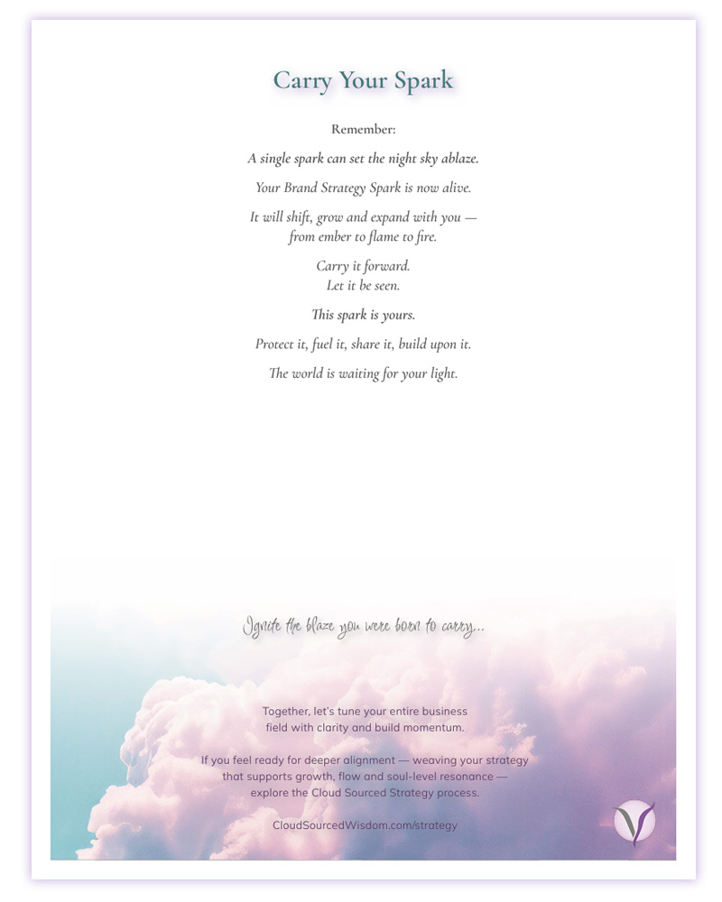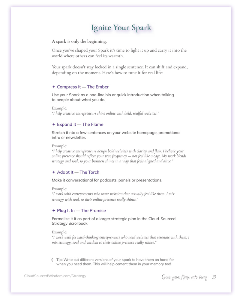 Whether you’re introducing yourself, writing your bio or refining your website, your Spark becomes the thread that weaves your story together—authentic, grounded, and unmistakably you.